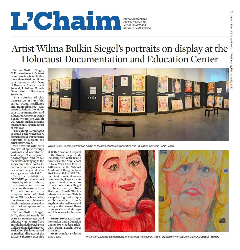 The opening of the Exhibition "Hope Resilience and Remembrance" at the Holocaust Documentation and Education Center was a total success. Artist Dr. Wilma Bulkin Siegel exhibited more than 90 Portraits of Holocaust Survivors and Liberators, 2nd, 3rd and 4rth generations.